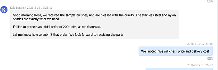 «Доброе утро, Роза! Мы получили пробные кисти и довольны их качеством. Щетина из нержавеющей стали и нейлона – именно то, что нам нужно».